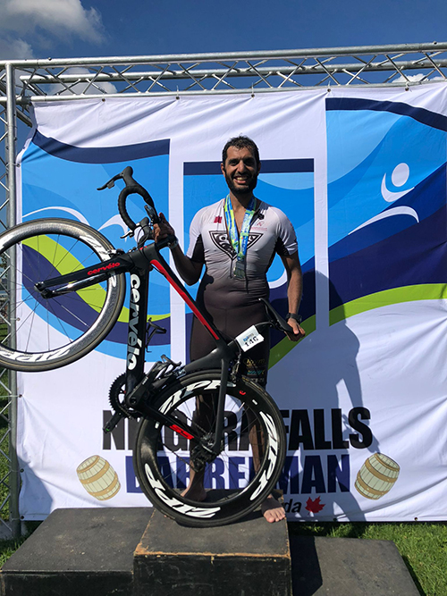 صورة مشاركتي في سباق بير مان نيجار فولس، وهو سباق يشبه سباق نص الرجل الحديدي من حيث المسافات. كانت هذه تجربة جميلة للغاية، خاصةً أنها أقيمت في كندا. كان هذا أول سباق أكون مستعدًا له بالتعاون مع مدربي.